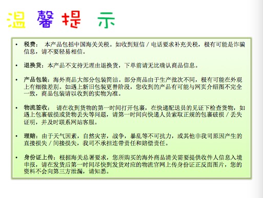 2:本司为代理代发平台,仅为错误发送的商品已经包裹负责。任何第三方物流导致的问题请自行联系物流咨询以及索赔,我司只做协助处理,请认真衡量物流风险。