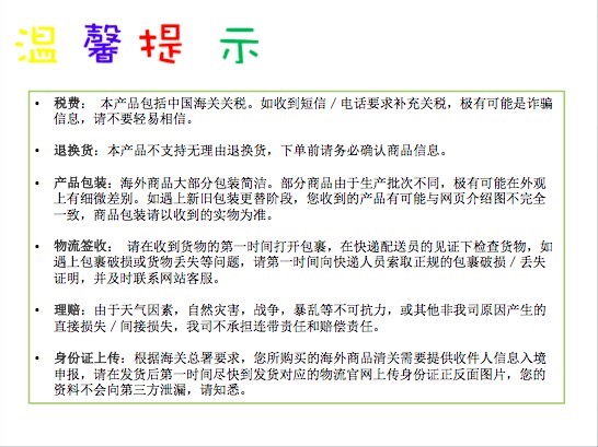 2:本司为代理代发平台,仅为错误发送的商品已经包裹负责。任何第三方物流导致的问题请自行联系物流咨询以及索赔,我司只做协助处理,请认真衡量物流风险。