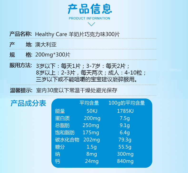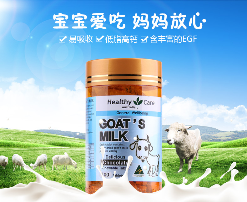 • 商品名称:Healthy care 羊奶咀嚼片 巧克力味 300粒 Healthy Care Goat Milk Chocolate Flavour 300c